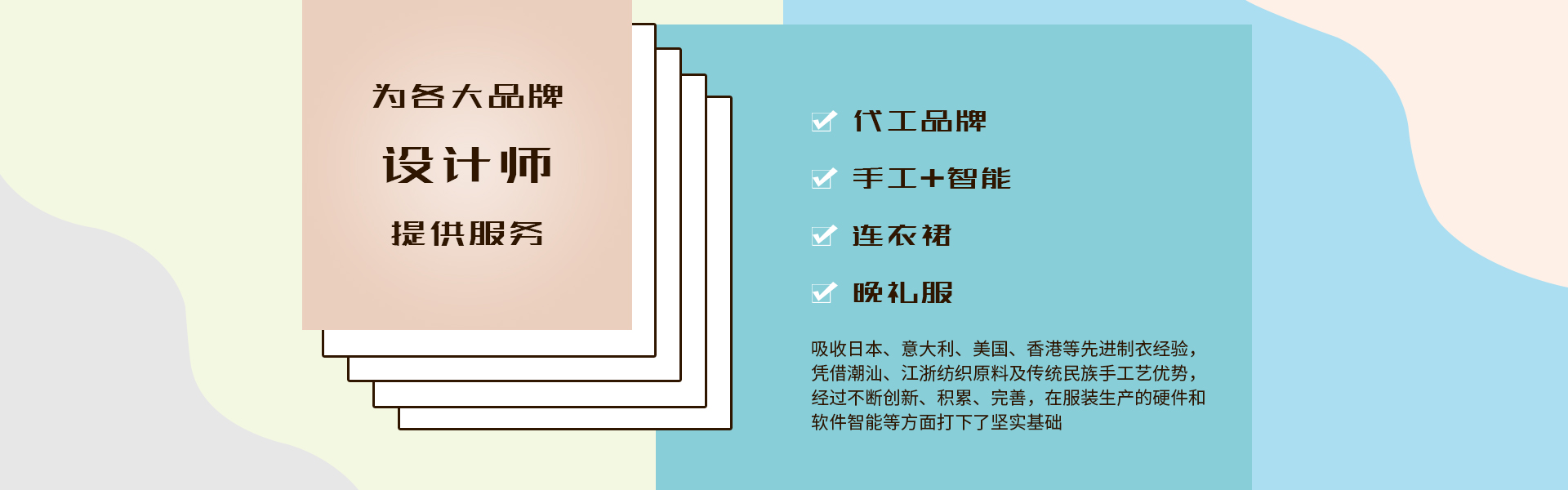 公司成立以來,依托中國經濟長期穩定發展良好的投資環境,堅持科學的管理理念,吸收日本、意大利、美國、香港等先進制衣經驗,憑借潮汕、江浙紡織原料及傳統民族手工藝優勢,經過不斷創新、積累、完善,在服裝生產的硬件和軟件智能等方面打下了堅實基礎,形成了一批專業的外貿服裝業務跟單隊伍和具有多年制衣經驗的技術團隊,是“質量穩定,信譽優異”的實體制造企業。